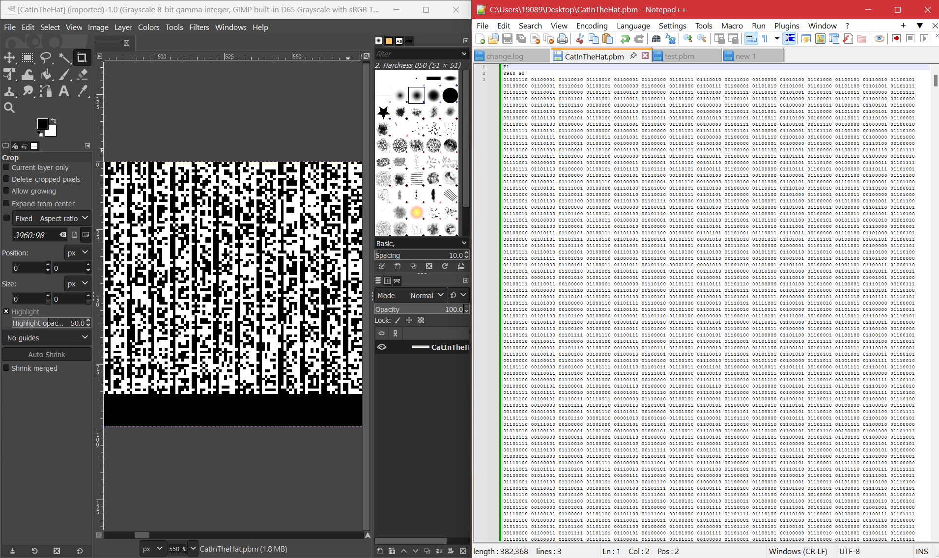 Usually TC2 files are .tiffs made on Photoshop or something, converting an image into something readable by the loom. To translate the binary directly into an image file I first had to make a .pbm file in some fancy notepad app and open it in Gimp to see it visually. From there I could convert that into a .tiff and weave away.